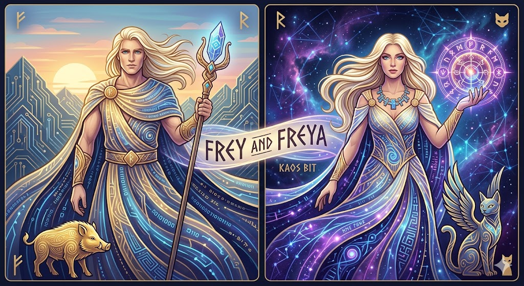 虚のフレイヤの側には翼の生えた猫(感情的な自由)と、世界を見るオーブ。背景は夜の星空――精神的・感情的な世界を自由に感じる者。